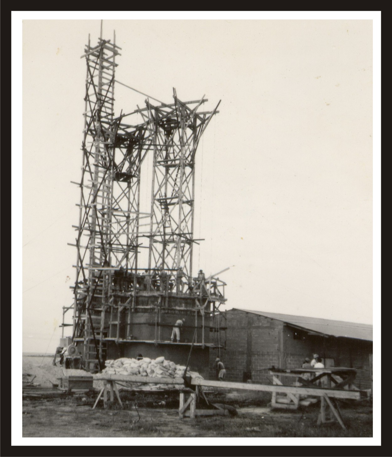 Outras observacoes: A estrutura circular vista na foto era provida de uma série de manivelas ativadas manualmente pelos construtores; o cimento era despejado na fôrma circular presa a esta estrutura; cada vez que uma camada de cimento era adicionada, um controlador apitava e todos os construtores na plataforma da estrutura circular faziam uma volta nas manivelas ao mesmo tempo; assim, a estrutura junto com a fôrma circular ia aos poucos subindo, até atingir o topo.